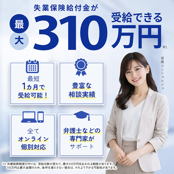 - 24時間いつでもLINEで問い合わせできる ※310万円の受給は、特定の条件下における受給総額の上限例です。実際の受給額や日数は、年齢・退職前の給与・勤続年数など個別の状況によって異なります。